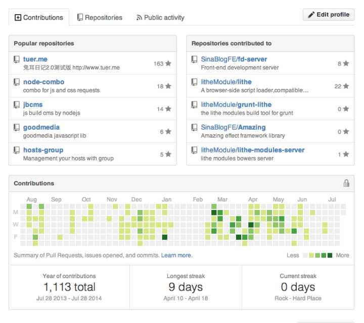 求职的时候会发现有些大公司要附GitHub帐号,对于要进入职场的互联网专业学生来讲,github账号优秀的话会很加分,如果能把下图的绿格子刷满的话,那你肯定会赢得招聘公司的青睐。