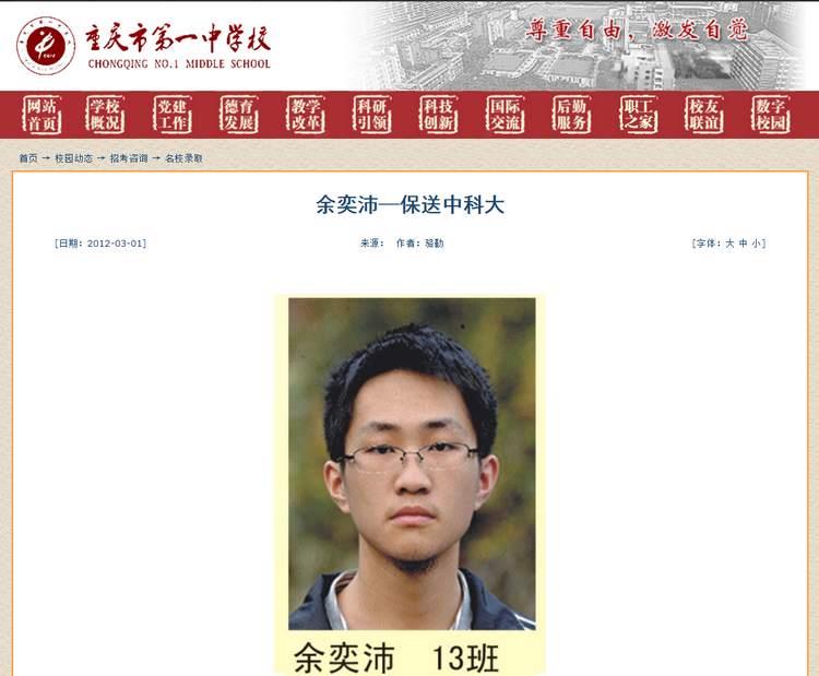 今天在重庆一中的官网上都还能找到余奕沛当年青涩的学生照