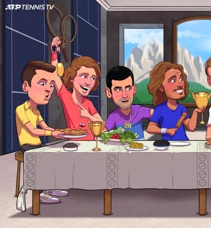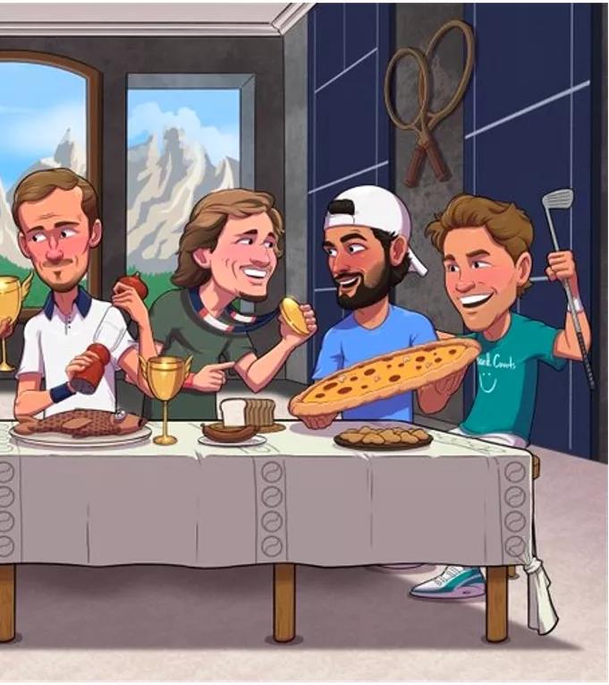 左三是德约科维奇,他胸前挂着金链子,下面写着20,表示他夺得了20个大满贯冠军,他面前的餐食是蔬菜水果,暗示他是一位素食主义者。此外,他的面前有一个金色的酒杯,表示他曾夺得年终总决赛冠军。