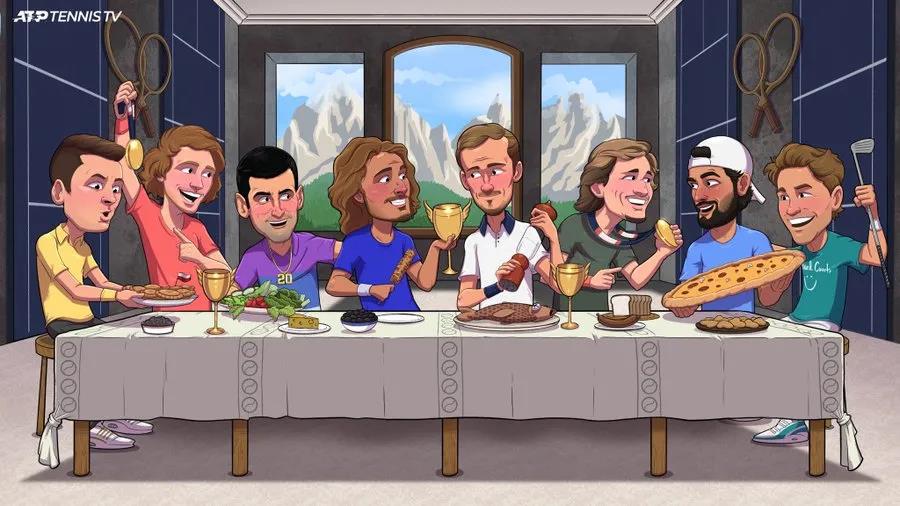相比起来,TennisTV的《最后的晚餐》人物显然是今年参加年终总决赛的八位球员,而其中人物形象、动作、打扮以及面前的食物也都是精心谋划,其中蕴含着诸多深意。