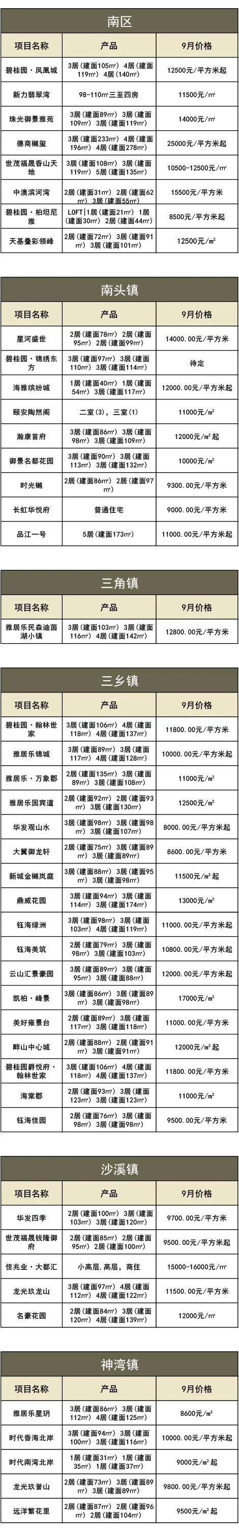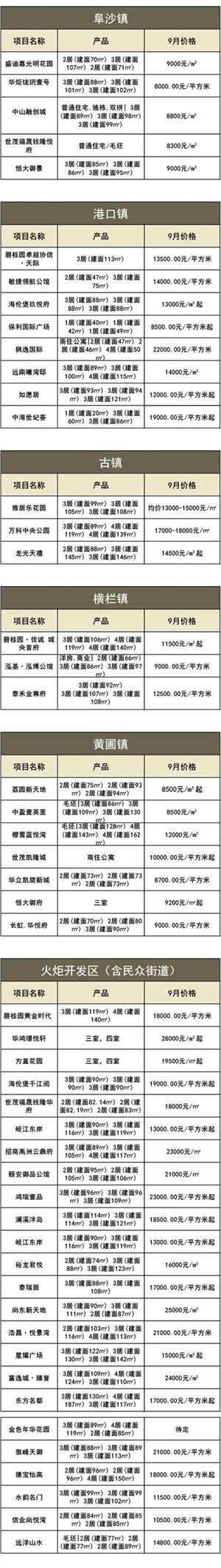 以下是中山9月份各区域在售项目的价格情况: