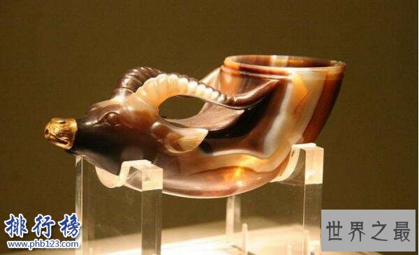 镶金兽首玛瑙杯,1970年在西安市南郊何家村出土,杯高6.5厘米,长15.6厘米,口径5.9厘米。是至今所见唐代唯一的一件俏色玉雕,也是唐代玉器作工最精湛的一件。镶金兽首玛瑙杯选用世界上极为罕见的红色玛瑙琢制,通体呈玻璃光泽,晶莹瑰丽。