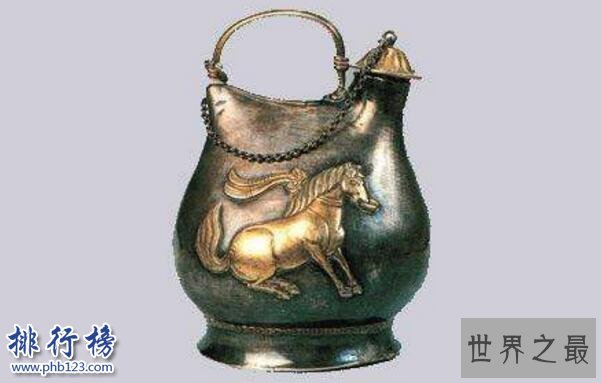鎏金舞马衔杯纹银壶于1970年在陕西省西安市南郊何家村出土,壶高14.8厘米,口径2.3厘米。外观上扁圆腹,莲瓣纹壶盖,弓形提梁,一条细链连结着壶盖与提梁。壶腹两侧用模具冲压舞马图,马肥臀体健,长鬃披垂,颈系花结,绶带飘逸。壶底与圈足相接处有“同心结”图案一周,系模仿皮囊上的皮条结。