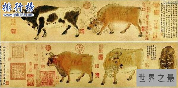韩滉《五牛图》卷是少数几件唐代传世纸绢画作品真迹之一,也是现存最古的纸本中国画。《五牛图》画在一张窄而长的桑皮纸上,五牛姿态各异、身形逼肖,全图除了一丛荆棘之外,不设任何背景,着重突出牛的既倔强又温顺的性格。
