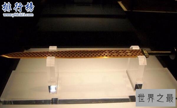 越王勾践剑,1965年在湖北江陵望山1号墓出土,剑长55.7厘米,宽4.6厘米,柄长8.4厘米,重875克,极其锋利。在出土后,人们将它表面清理干净后,轻松的划穿了一摞一百张厚的白纸。
