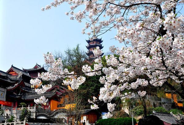 从鸡鸣寺到和平门一线这一段的樱花就被人们称为南京最美樱花大道。古朴至雅的鸡鸣寺衬托着粉粉嫩嫩、美不胜收的樱花树,显得格外有韵味。