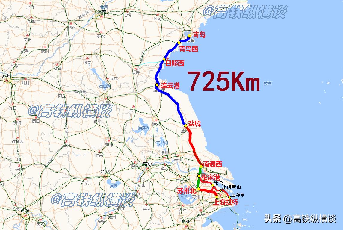青岛至上海高铁,是拼凑线路,其中青岛西、盐城、苏州北3站应是必停站,参照上海虹桥至长沙南的平均时速246公里计算,青岛至上海虹桥全程725公里,预计旅程时间为2小时57分,可压缩在3小时以内,可大大提升沿海客运专线的运输效率。