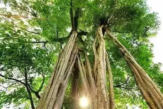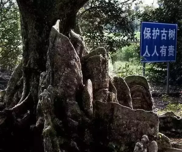 300 年树龄的大树,树围巨大,能 达四五米,它的根部成板状裸露在外 面,虬龙似的扭曲、伸展、盘错,几乎有 两米高,本身就好像一座惊心动魄的巨 大雕塑。