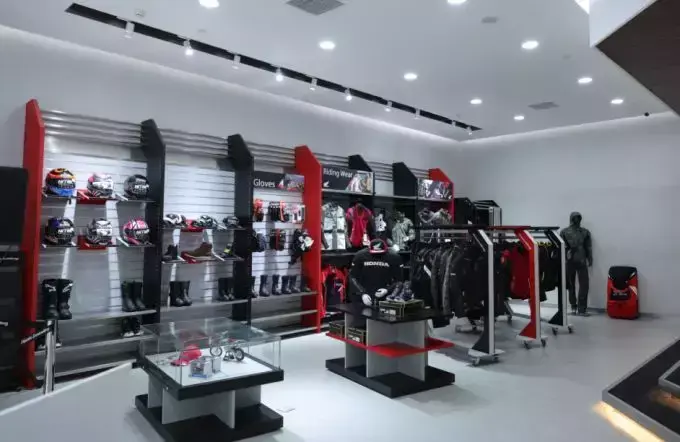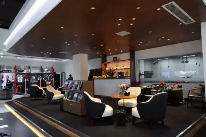 作为一家高端摩托车店专门为用户设置了休闲区域以及品牌装备部品区