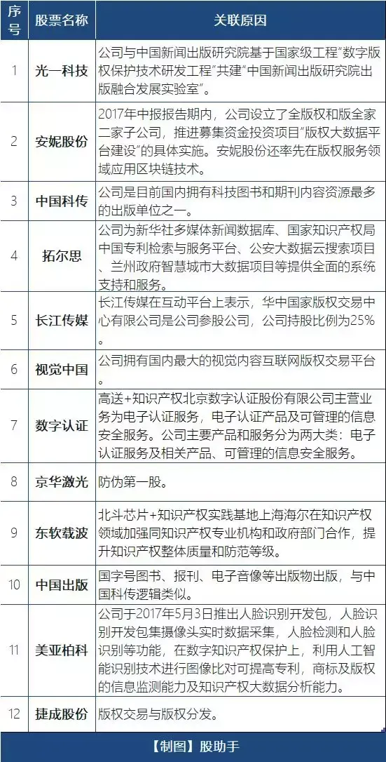 为方便大家投资选股,题材通特为大家对知识产权概念股作盘点,供参考。