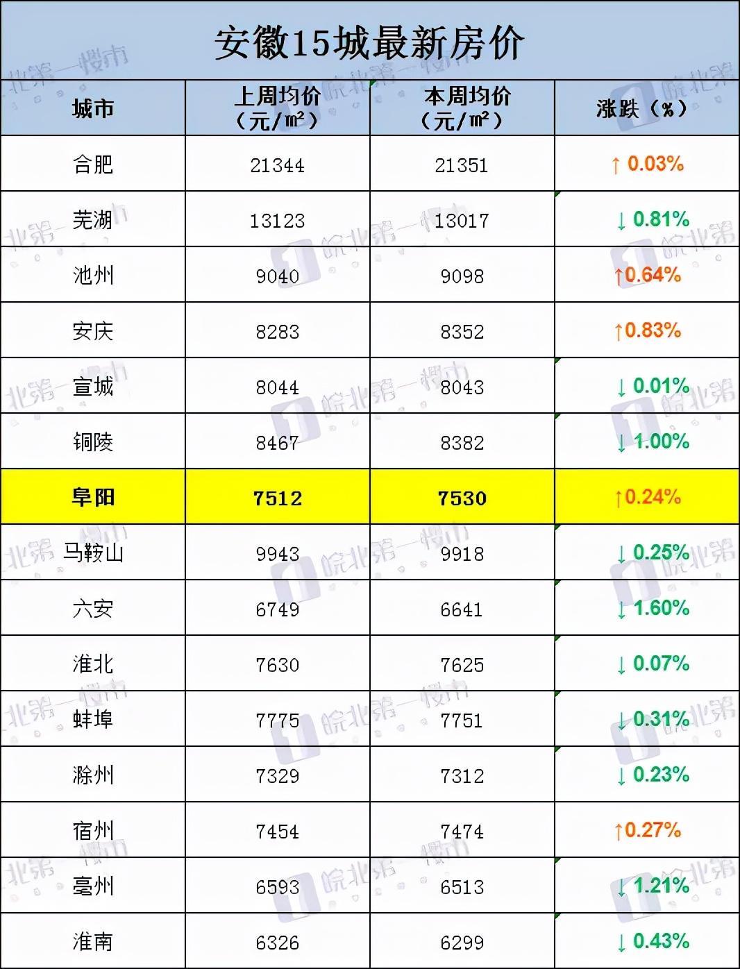 在本周15城中,5城房价出现上涨,合肥、阜阳、安庆、宿州、池州,其中安庆涨幅最高,为0.83%。