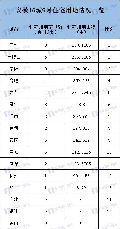 具体到安徽各市9月份住宅用地情况来看,宿州各县市以600.4185亩稳居全省之首,阜阳以384.084亩住宅用地位居全省第三~