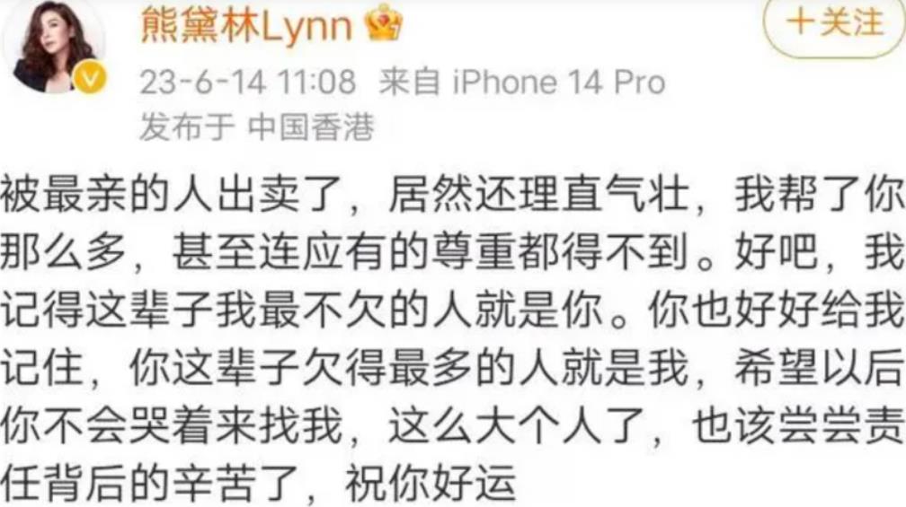 六月中旬,熊黛林在某社交平台发文,被自己最亲的人出卖了,对方竟然还理直气壮,引起了网友热议。
