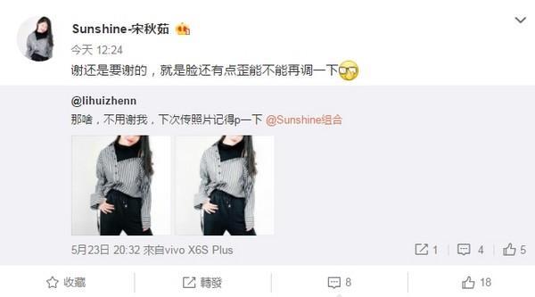 ▲宋秋茹回应帮她P图的网友。(图/翻摄宋秋茹微博)