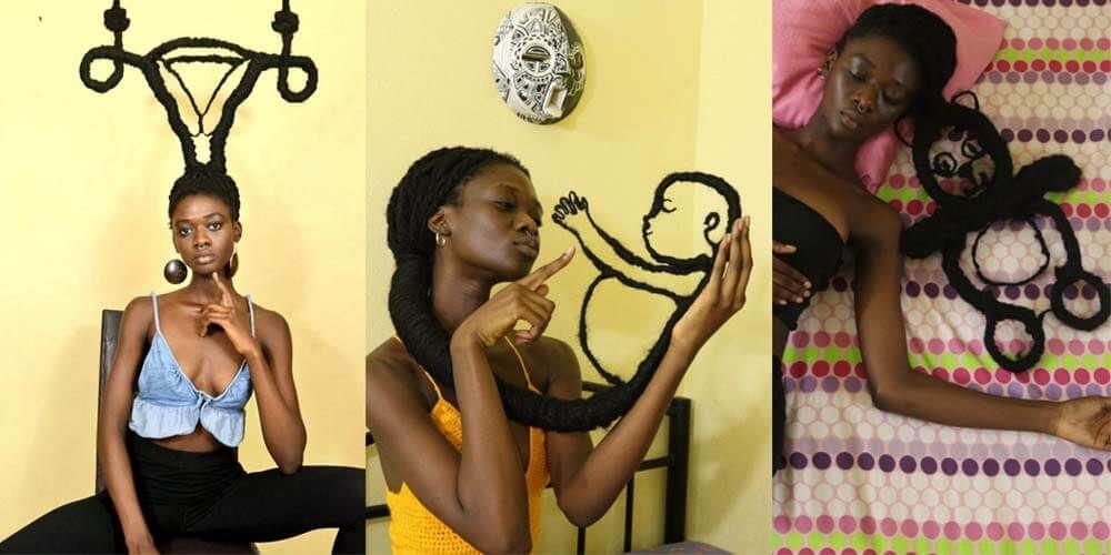一般女生能够把长发系成小马尾、辫子等各种简单造型,但才华横溢的年轻艺术家能将自己浓密的曲发塑造成一种种有趣、生动,还别具意义的艺术品。蕾蒂莎是象牙海岸土生土长的非裔妹子,5岁起便培养出编发的兴趣。在她20来岁的青春年华里,通过针、线、铁线、羊毛以及其他材料给自己的头发创造另一种奇迹,向其他非裔女性传达自信美的重要性。当然,这么富有美感的传达方式,可不是随便动一动手就能够完成的。蕾蒂莎的发型编织时间往往需要3小时以上,有时甚至需要耗时半天。除了有亲吻、脚踏车、行走的双脚这些创意又趣味的设计,也不乏手枪和性别平等天秤形状的造型。