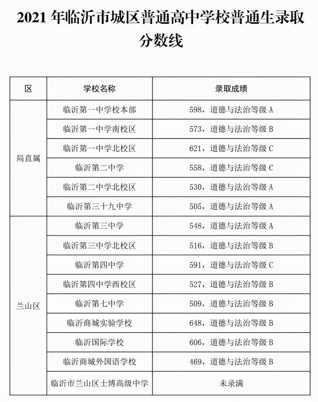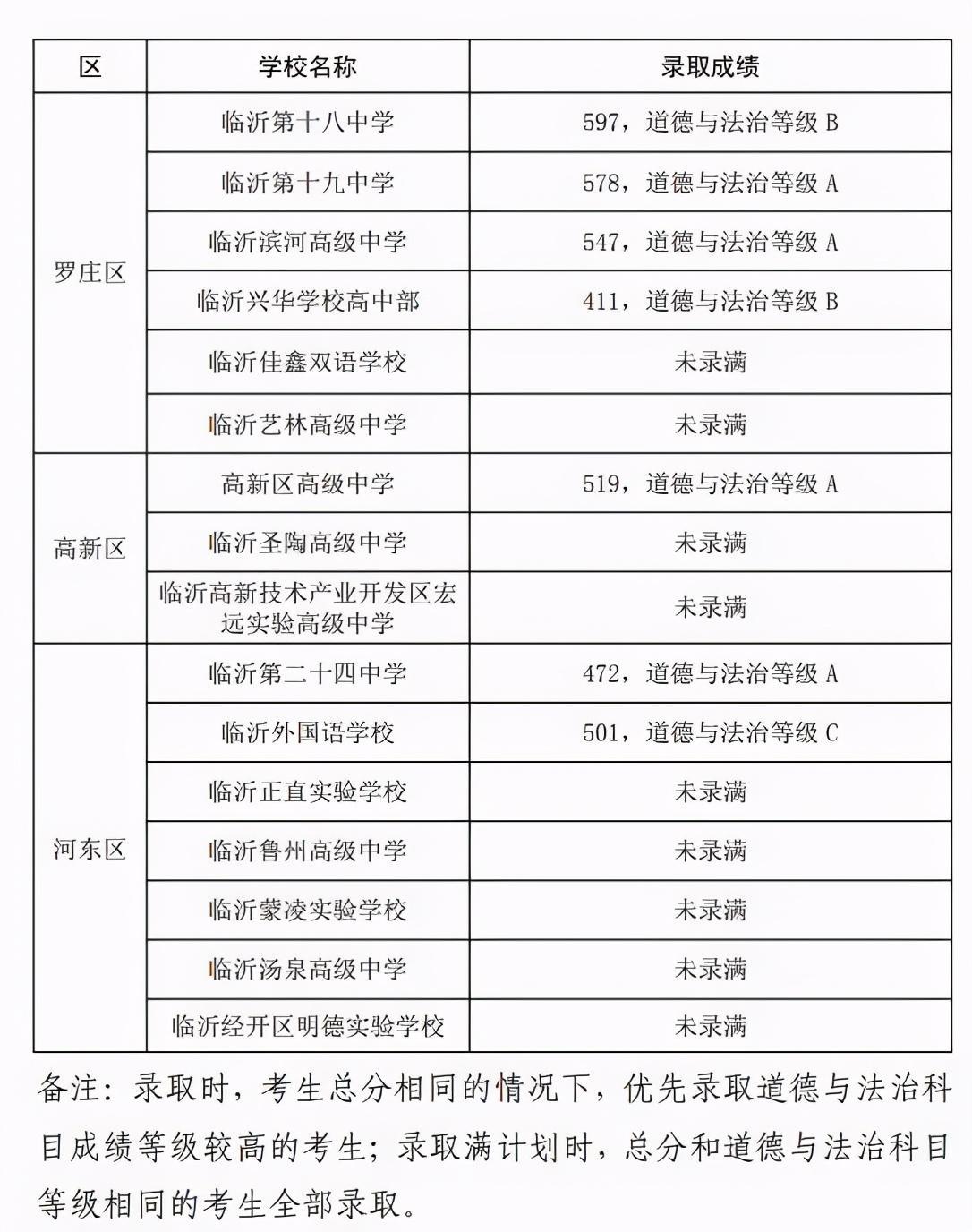 临沂市城区普通高中普通生招生录取工作由市教育局统一组织进行,现已录取完毕,并公布了各学校录取分数线。其中录取分数线排在前三位的分别是:临沂商城实验学校648分,临沂一中北校区621分,临沂国际学校606分。