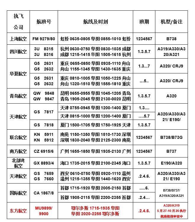 自2019年3月31日起至2019年10月26日,阜阳机场将执行夏秋航班时刻表。调整后,阜阳机场将新增飞往鄂尔多斯航班(5月27日-10月26日执行)。