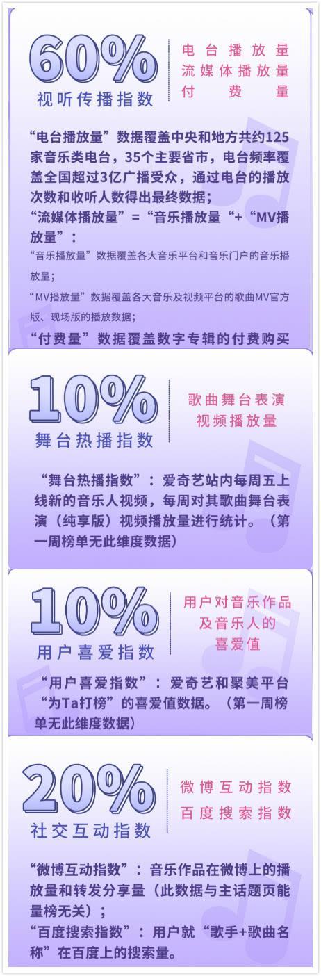 榜单构成:视听传播指数占比60%,由电台播放量,流媒体播放量和付费量决定 ;“舞台热播指数”占比10%,即歌曲舞台表演的视频播放热度 ;“用户喜爱指数”占比10%,即用户对音乐作品及音乐人的喜爱值; 社交互动指数20%。