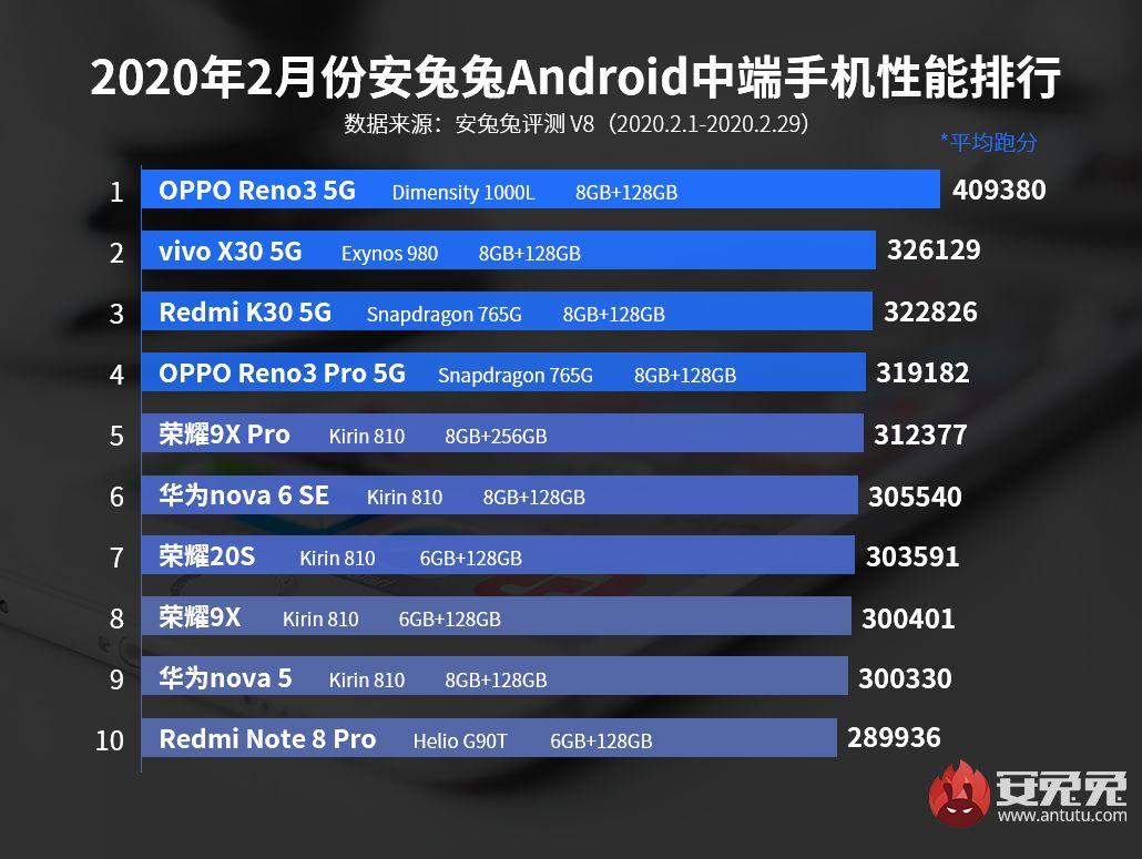 最后来看看安卓中端手机性能榜,第一名是搭载天玑1000L处理器的OPPO Reno35G,第二名是搭载三星Exynos 980的vivo X30 5G,第三名则是搭载高通骁龙765G处理器的红米K30 5G。