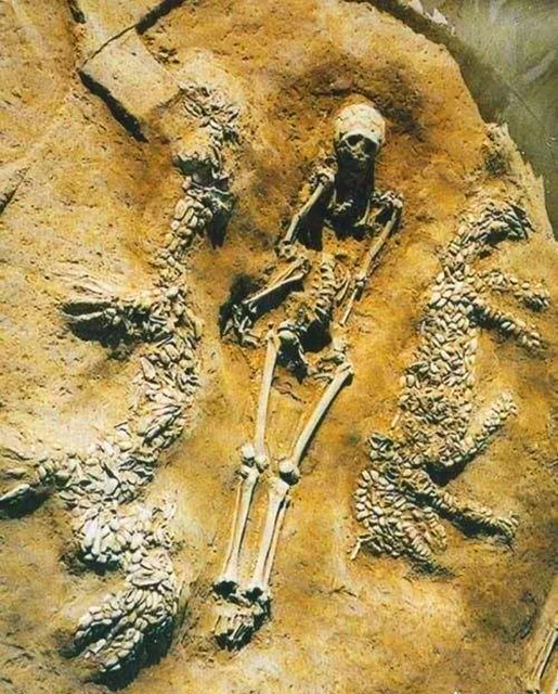 1987年考古学家在河南濮阳西水坡遗址发掘了一座仰韶文化墓葬,在墓主骨架两侧发现用蚌壳摆成的龙虎图案,距今约6400年。