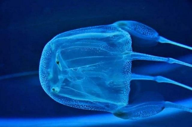4、方水母:方水母又被喊干箱水母,形状十分的美丽,身材是呈通明的淡蓝色,然而是不要被它的“颜值”捉弄,这种水母的触须的刺细胞中尽是毒液,十分的恐怖,假如人类触遇到,会在几分钟内牺牲。
