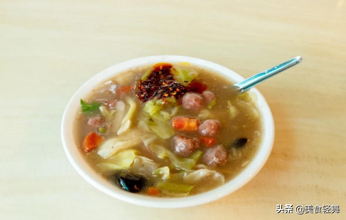 它是用牛羊骨熬汤,加入了现做的牛肉丸,浑圆Q弹,里面还有土豆、圆白菜、胡萝卜、牛肉粒、豆角等,用大量的胡椒粉调味,然后勾芡而且。
