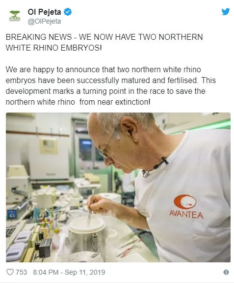 8月30日,研究人员宣布,其中7枚卵细胞已经成熟,可以与保存许久的北白犀精子结合。