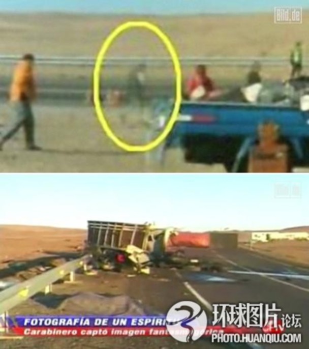 据德国《图片报》12月20日报道,克日,智利一家电视台报道了一条诡异的消息:在该国A-16高速公路上曾产生了一路严峻的车祸,过后不久,一名司机竟然拍到了死者的“幽灵”在事情现场彷徨,好像在贪恋本身的“躯壳”。