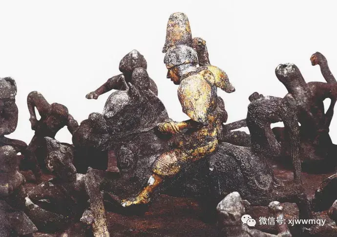 这个骑马金人头有高冠,全身披挂着盔甲,但脚却是赤裸着的,肩部呈鸟翅展开之状,这代表它不是普通人,而是神灵所属的琼布。