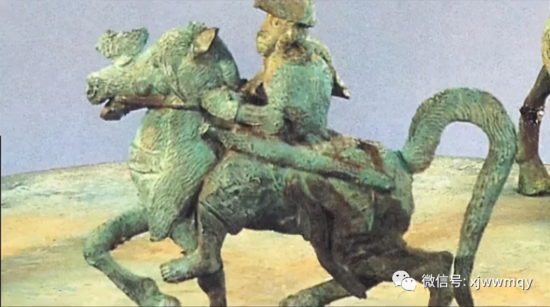古滇国青铜鼓上的骑马金人雕塑,赤着双脚,正在征战或者狩猎中,年代相当于中原的春秋战国。
