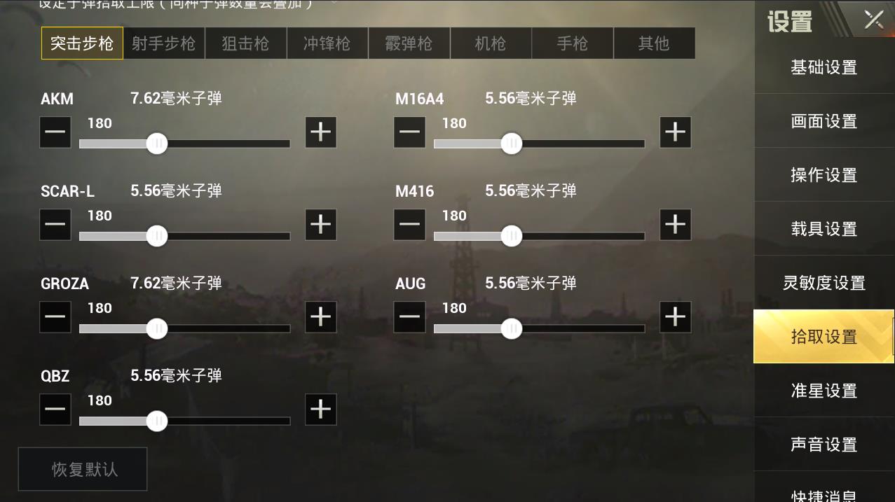 3、每一种枪的子弹拾取上限也可以设置哦,我们常用的突击步枪子弹默认上限都是180,对于经常用步枪的玩家来说,这肯定是不够的,所以可以在设置中设置高一点哦~具体上限数量小伙伴们根据需求来定,波波姬觉得一般不超过300发,太多了就没地方装起来东西啦~
