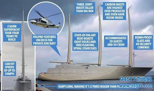 这艘游艇包括桅杆的高度达到了将近100米,这个高度甚至比法国的凯旋门的高度要高两倍,这艘船采用了风帆和柴油电力相结合的混合动力,能够在达到最高24节的时速,最为一艘体积如此庞大的游艇,这种速度堪称迅捷。