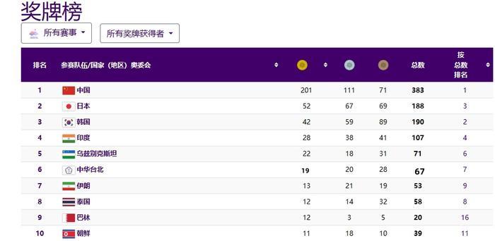 杭州亚运会最终奖牌榜!中国队201金完美收官,最后一金留在中国