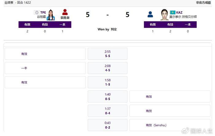 收官日最后结束的项目就是空手道,决出两枚金牌,日本队获得男子团体型金牌。最后一枚金牌来自女子组手50公斤级决赛,中国台北选手谷筱霜在0-5落后的情况下追成5平,最后绝杀哈萨克斯坦选手莫尔季尔·然格贝尔拜,拿下最后一枚金牌。现场观众鼓掌叫好,本届亚运会的最后一枚金牌留在中国!