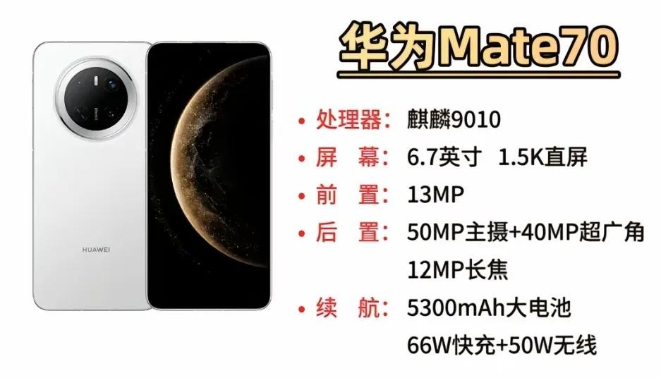 华为Mate70搭载的是麒麟9010处理器, 性能方面杠杠的, 日常使用流畅不卡; 屏幕方面是6.7英寸的直屏, 手感非常好, 喜欢直屏朋友可以选它, 续航能力很强, 影像方面同样出色。