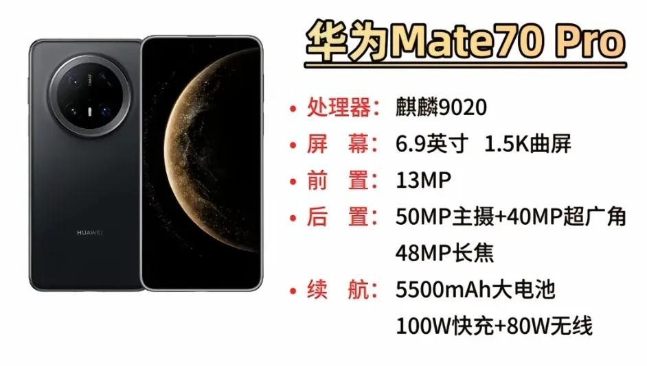 华为Mate70 Pro搭载的麒麟9020处理器, 是目前最强的麒麟芯, 性能不用多说; 屏幕配载的是6.9英寸的等深微四曲屏, 充电方面是100W有线+80W无线的组合, 影像长焦也来到了4800万像素。