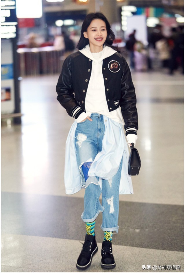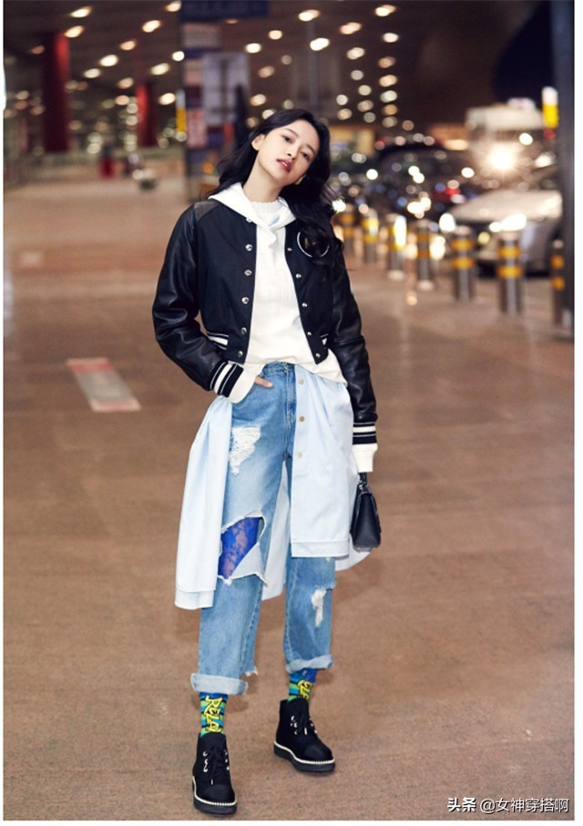 这一对组合就是卫衣的进阶版穿搭了,不仅和衬衫混搭,还在外面套上了一个保暖性十足的棒球服,三种不同风格单品的叠穿,超级时髦前卫!孙怡内搭一件白色的连帽卫衣,外套了一件黑色的棒球服,休闲时髦不失青春感,而最里面的衬衫则露出了不规则的衣摆,显得更加随性,超级洋气!