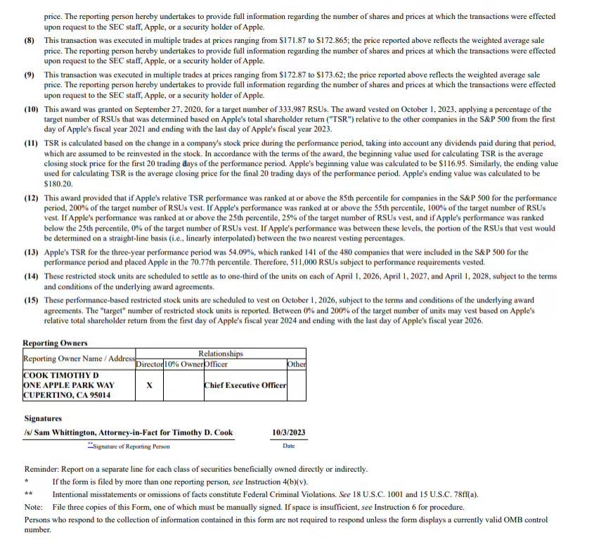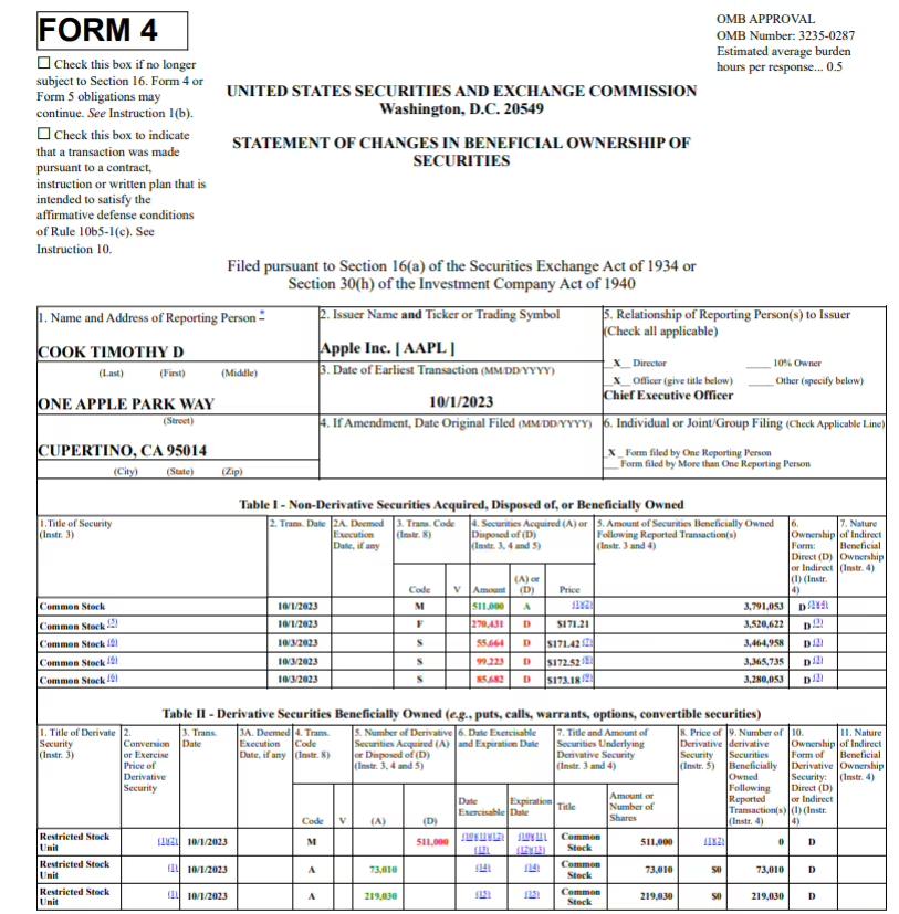 就在前几日,据媒体报道,随着苹果公司股价由纪录高位跌落,首席执行官库克出售了税后价值约 4100 万美元(约合人民币 2.9936 亿元)的苹果股票,规模创其逾两年来最大。根据 10 月 3 日提交给美国证券交易委员会(SEC)的文件,库克卖出了 51.1 万股股票。