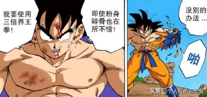 如果你想要强行突破的话,那么只会让自己瞬间失去力量,凉得更快而已,所以说界王拳与火影中的八门遁甲真正的区别就是,界王拳原本就是增长你基础值的招式,不是让你突破极限,得到质的飞跃的招式,也就是说,你战斗力是1,那用了界王拳也不会怎样,而八门遁甲则是直接可以让你原地起飞。因而界王拳压根就不是不少朋友所想象的那样无敌,从一开始,鸟山明就给界王拳下了一个定义,这个定义哪怕是孙悟空都无法突破的,也因为这样,使得界王拳最后也坐了冷板凳。