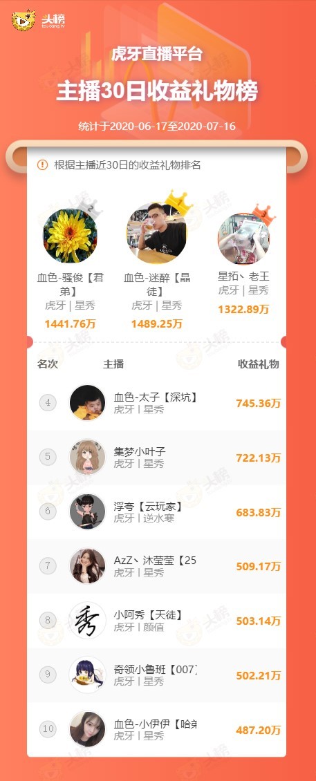 虎牙主播流水榜:血色公会成最大赢家,星秀一哥骚俊收礼破千万