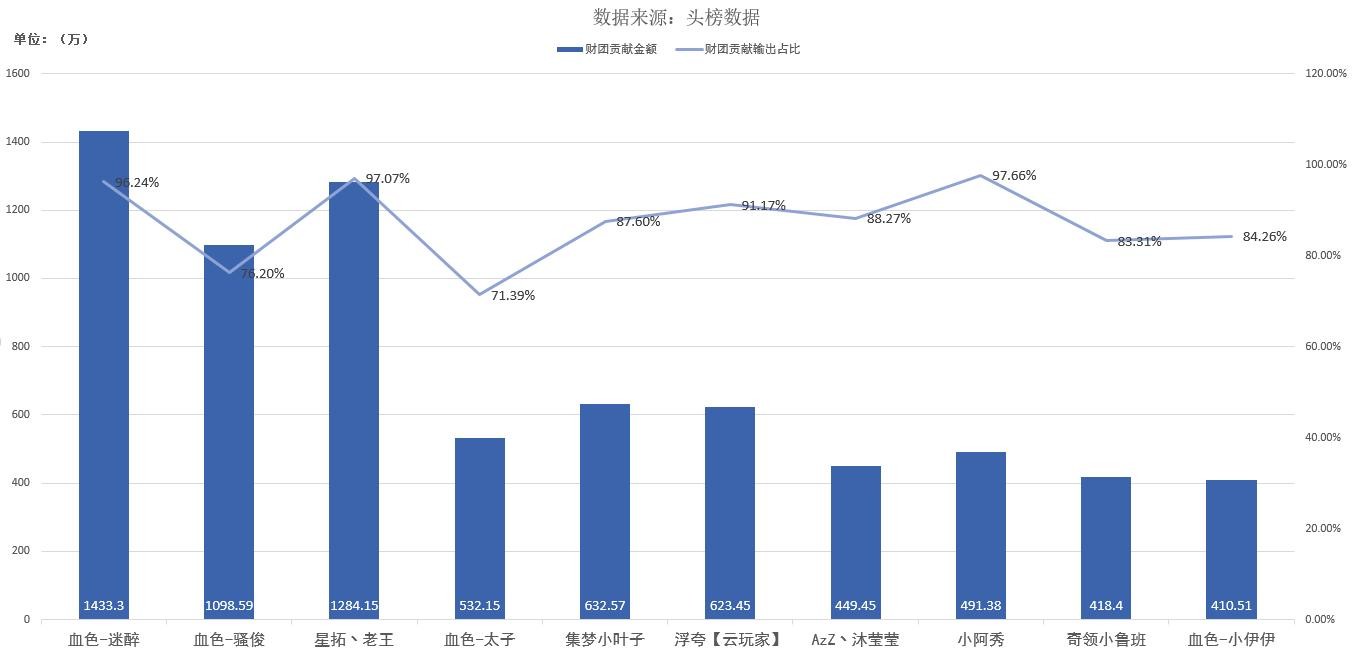 以土豪贡献输出为主要收入的星秀版块,本期十位主播财团贡献率均在70%以上。小阿秀、迷醉、老王、浮夸四位主播财团贡献率在九成以上,老王的财团贡献金额高达1280万,居十位主播之首。