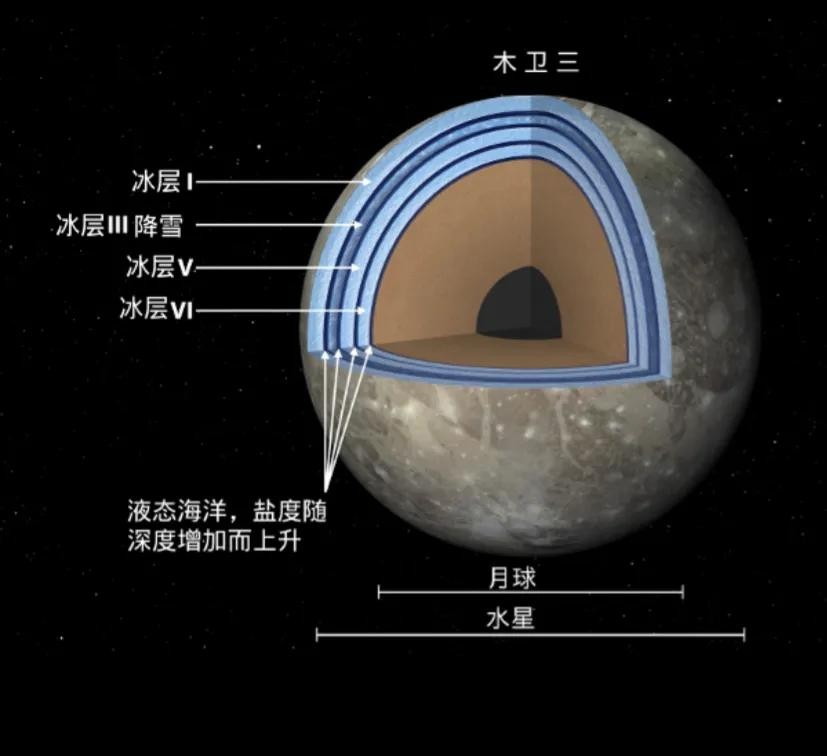 木卫三不仅是太阳系最大的卫星,含水量最多的星球,它还是太阳系中已知的唯一一颗拥有磁圈的卫星,其磁圈可能是由富铁的流动内核的对流运动所产生的。木卫三主要由硅酸盐岩石和冰体构成,星体分层明显,拥有一个富铁的、流动性的内核。