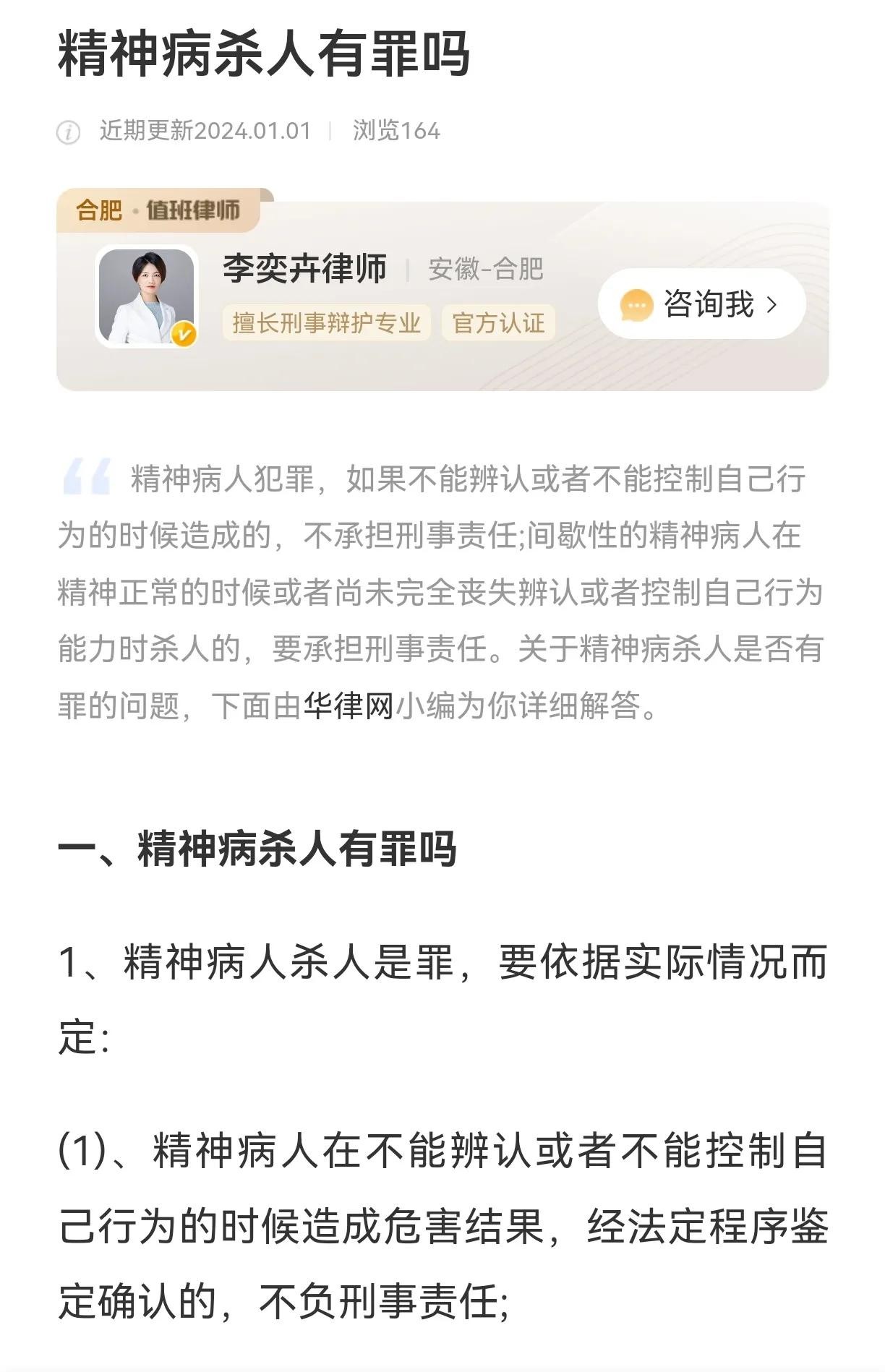 虽然案件杀人者为精神病患概率很大,但关键的是精神病人发生恶性杀人事件,是否该承担法律责任?事后的赔偿又该如何落实?希望法律界朋友给予解惑!