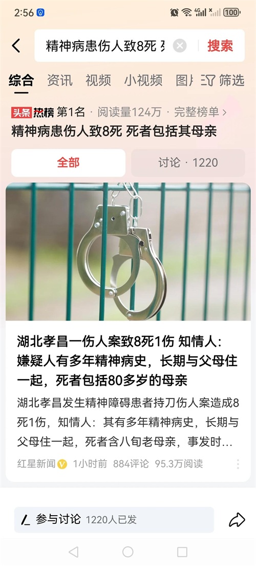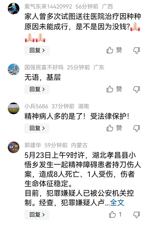 昨天上午在湖北孝昌县发生了一起精神病患致八死一伤恶性伤人事件。