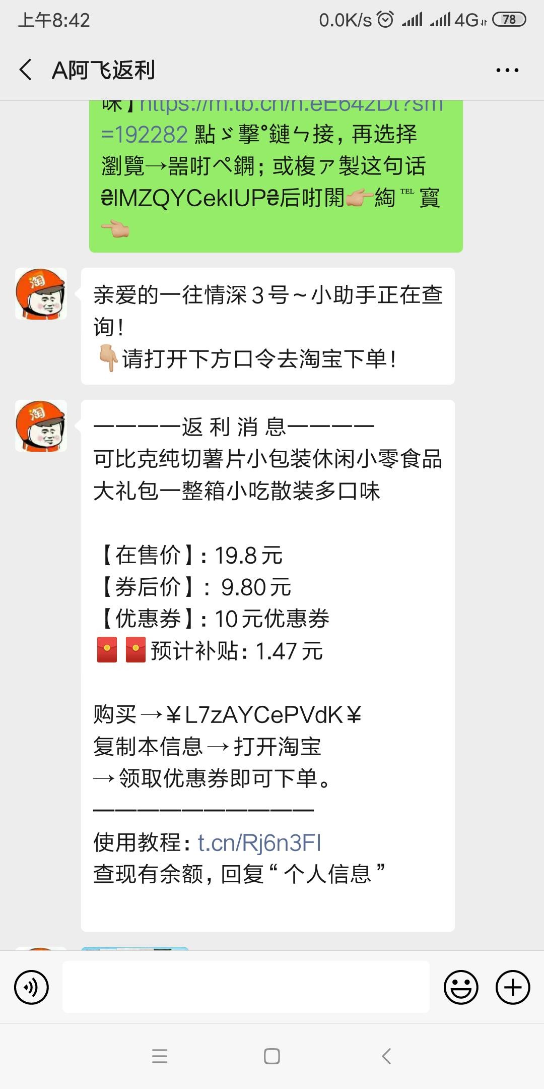 添加好友后,返利机器人给我发了淘宝、京东、拼多多返利的教程,同时给了我0.88元红包。