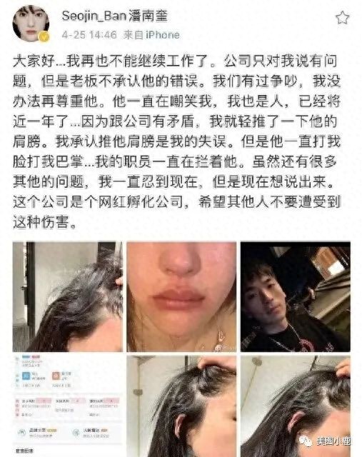 4月25日下午,网络红人潘南奎发文称称被公司老板暴打,原因是两人工作理念不同,而这次冲突却是潘南奎最先动手,用手推了对方肩膀,没想到之后公司老板竟然用手打她的脸,导致潘南奎花费巨额金钱的美丽脸庞变形。