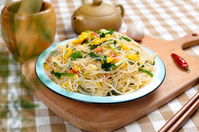 6. 炒粉:炒粉是一道以米粉为主要食材,配以鸡蛋、肉丝、蔬菜等制成的传统菜肴,口感香鲜,味道丰富。