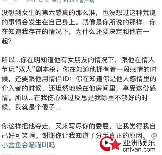 随后另一女网友自曝自己才是正宫,小盒鱼才是插足别人的那个小三,称“你这样把他夺走,又来写尽你的委屈,让我觉得自己好可笑啊”,还指责对方与焉栩嘉“玩双人剧本杀”。