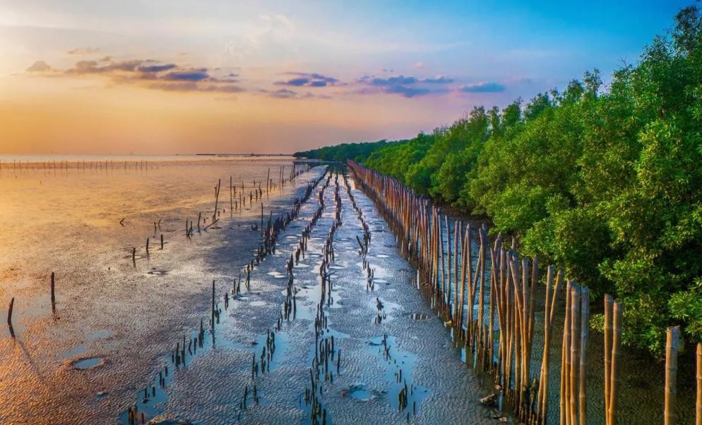 4. 金海湾红树林:是北海市最大的红树林保护区之一,这里有着茂密的红树林、清澈的河流、广阔的海湾等多种自然景观。在这里,游客可以乘坐竹筏游览红树林,欣赏美丽的自然风光;也可以沿着木栈道漫步在红树林中,感受大自然的魅力。