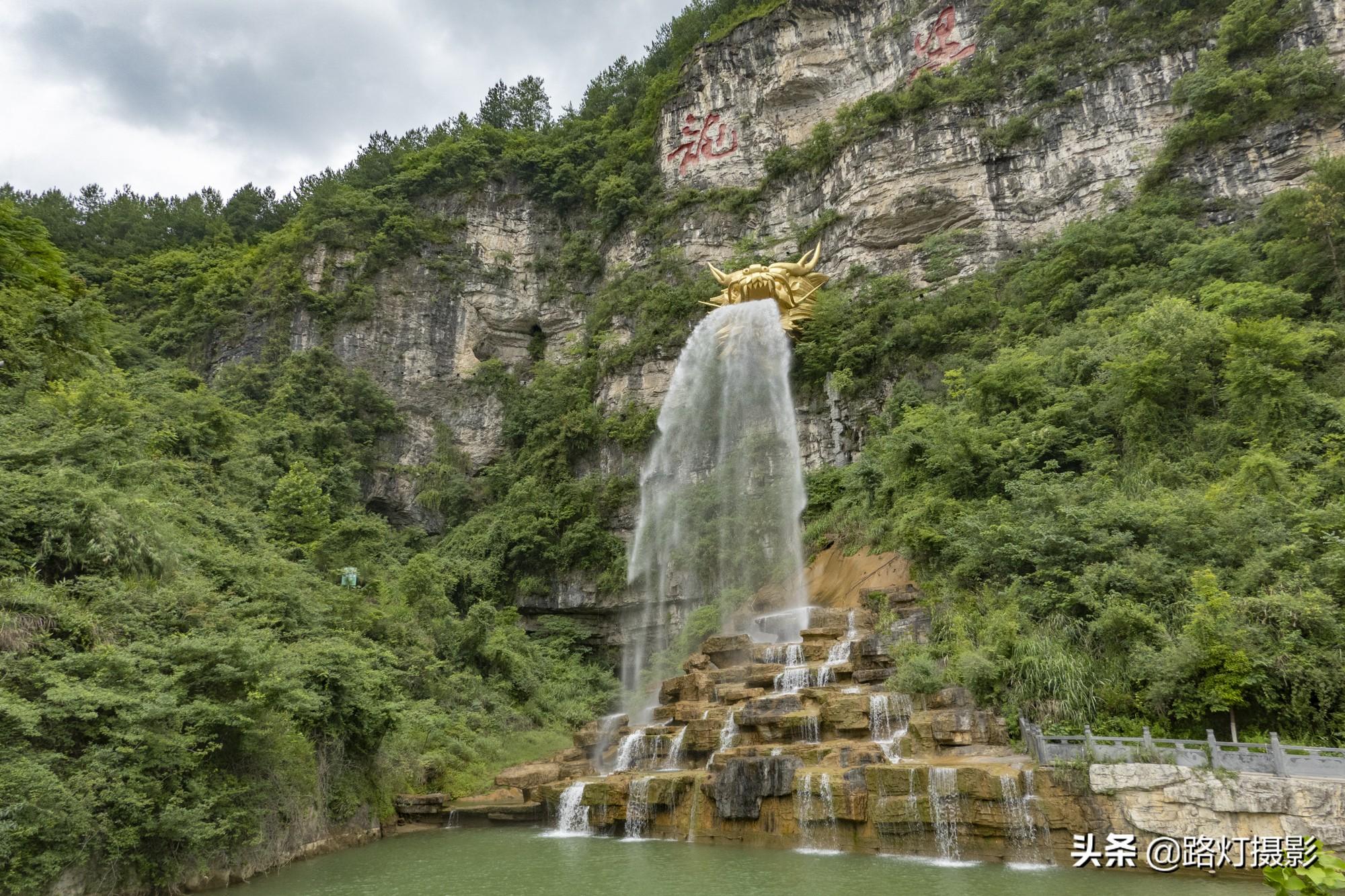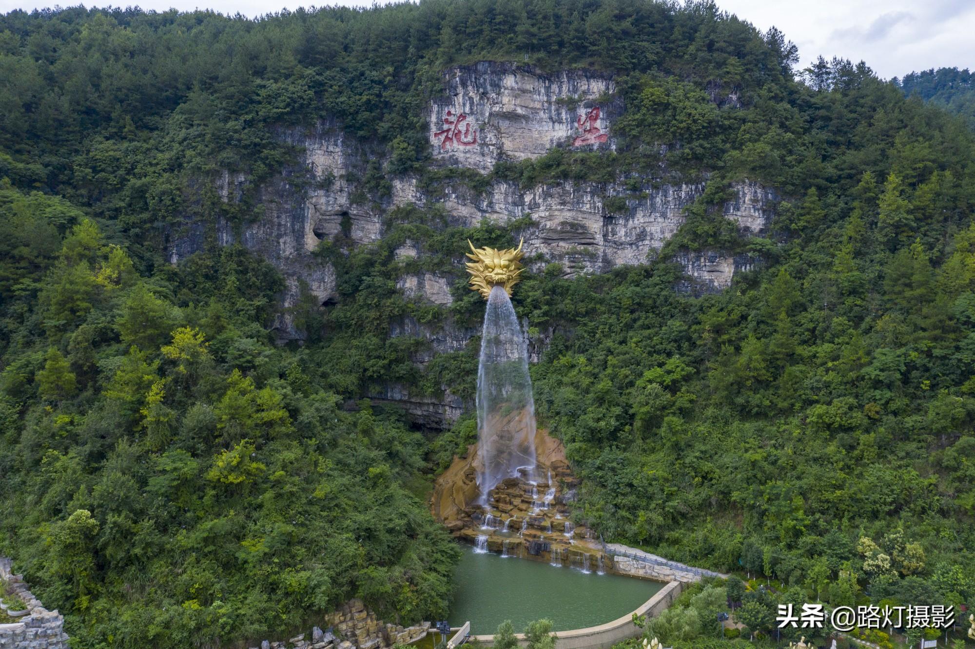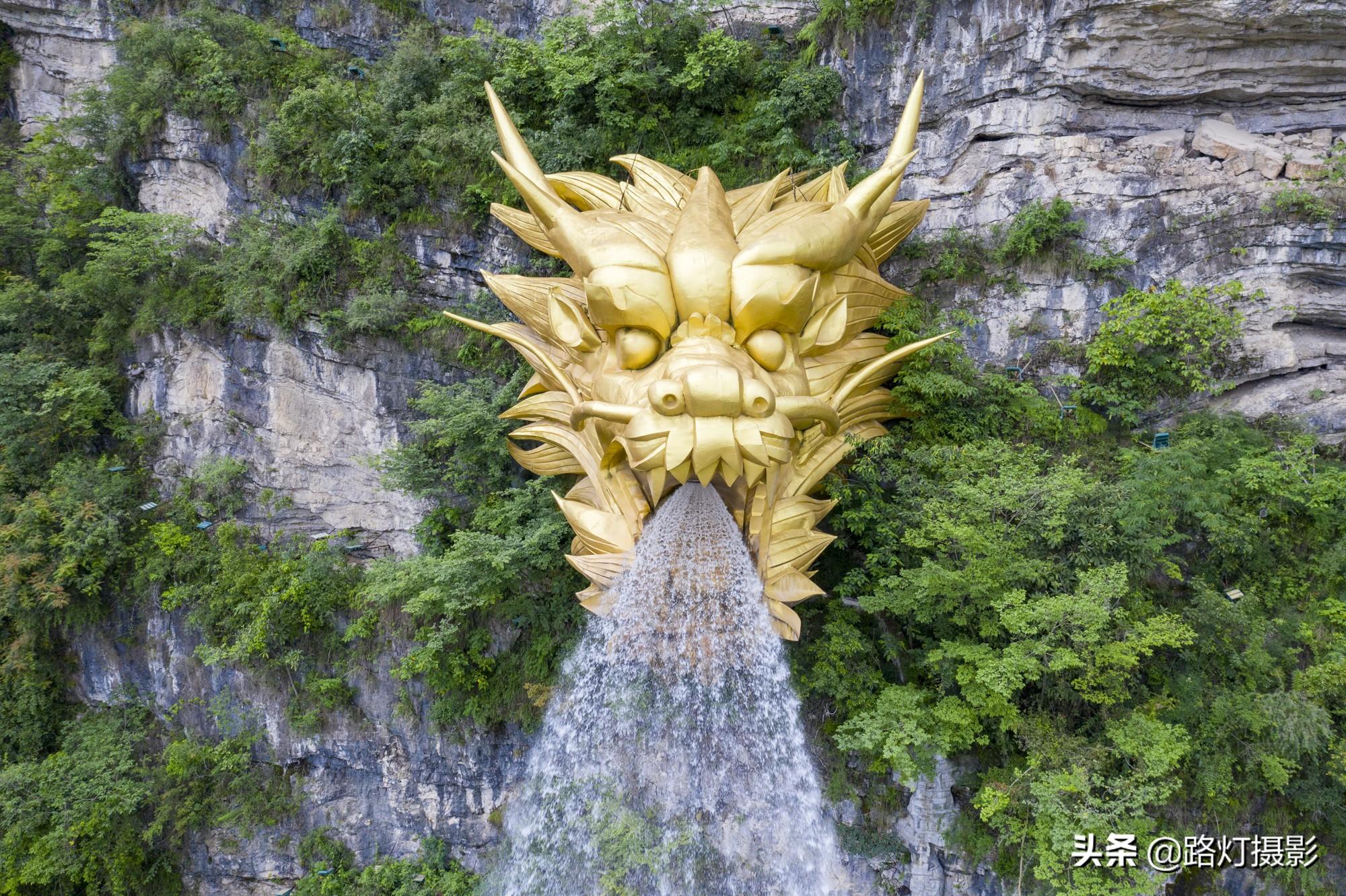 据说打造这座龙头花了上百万元,龙头高16米,重约12吨,坐落于悬崖峭壁之上,从龙头喷出来的喷泉落差最大可达60米。